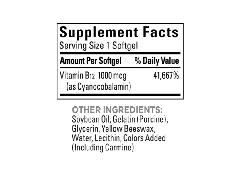 Suplemento con alto contenido de vitamina B12 (1000 mcg) por cápsula blanda, que apoya el metabolismo energético, la función cerebral y el sistema nervioso