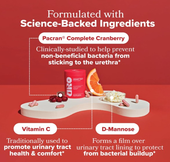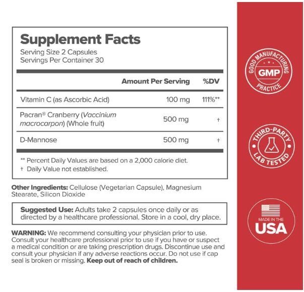 Suplemento diario para la salud del tracto urinario, que contiene 500 mg de arándano Pacran®, 500 mg de D-mannosa y 100 mg de vitamina C. Ayuda a prevenir la adhesión bacteriana en la uretra, promueve la limpieza del tracto urinario y favorece una frecuencia urinaria normal. Es vegano, libre de gluten, non-GMO y cruelty-free