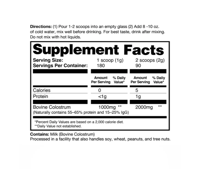 Suplemento en polvo de calostro bovino puro, rico en bioactivos y nutrientes para fortalecer el sistema inmune, apoyar la salud intestinal y promover la regeneración celular. No contiene GMO, gluten ni soya; viene de forma ética y se mezcla fácilmente con bebidas frías.
